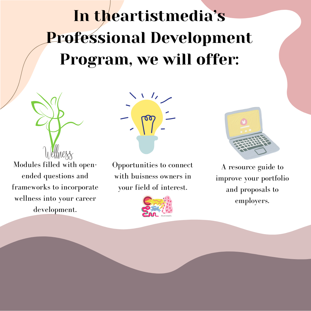 Our multi-media company, theartistmedia, is proud to launch our Professional Development Program in the summer of 2025. This program is 2 weeks long, and participants will meet twice a week to discuss professional and personal development. We will be sharing resources about career readiness through resume building and technical skills. Additionally, we will be sharing insight on self awareness through hosting workshops and having open ended discussions about your social skills.